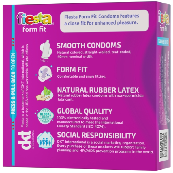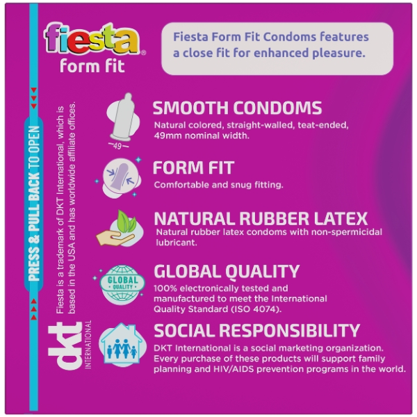 Fiesta Form Fit được làm từ cao su tự nhiên đạt chuẩn chất lượng, trải qua kiểm định về độ bền, đàn hồi và tính an toàn trước khi đưa ra thị trường. Khi sử dụng đúng theo hướng dẫn (đeo đúng cách, kiểm tra hạn sử dụng, tránh dùng chung với dầu bôi trơn không phù hợp), sản phẩm giúp tăng khả năng bảo vệ khi quan hệ, giảm nguy cơ mang thai ngoài ý muốn và hạn chế lây nhiễm một số bệnh qua đường tình dục.