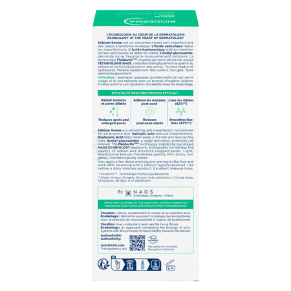 Sébium Serum là serum điều trị da dầu mụn thế hệ mới, được bác sĩ da liễu kê đơn và nghiên cứu tại phòng thí nghiệm NAOS. Mụn ở người trưởng thành ngày càng phổ biến và thường đi kèm với các dấu hiệu lão hóa như xỉn màu, nếp nhăn và thâm sau mụn. Sébium Serum được phát triển để giải quyết đồng thời cả hai vấn đề này. BHA (Axit salicylic) tẩy tế bào chết và thông thoáng lỗ chân lông trên bề mặt da, trong khi NAG (Acetyl Glucosamine) thúc đẩy tổng hợp hyaluronic acid nội sinh và tái tạo tế bào từ bên trong. Công nghệ Fluidactiv™ độc quyền điều chỉnh tính chất bã nhờn và ngăn ngừa bít tắc lỗ chân lông. HA phân tử nhỏ cấp ẩm bề mặt ngay lập tức, giúp da mịn màng và căng mướt hơn.