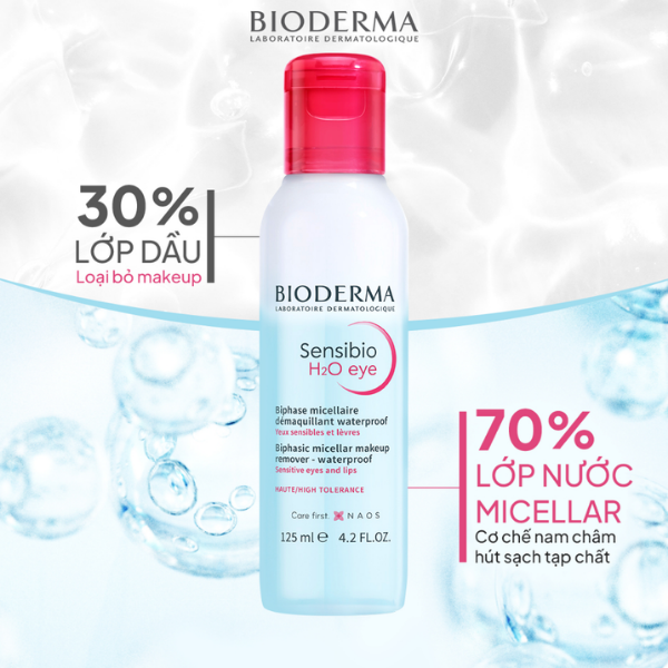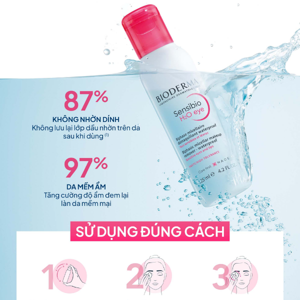 Sensibio H2O Eye là giải pháp tẩy trang vùng mắt chuyên biệt từ Bioderma, được phát triển riêng biệt với công thức dịu nhẹ hơn Sensibio H2O dành cho mặt, nhằm phù hợp với độ nhạy cảm đặc biệt của vùng da mắt và mí mắt. Vùng da quanh mắt mỏng hơn nhiều so với phần còn lại của gương mặt và không có tuyến bã nhờn, do đó cần sản phẩm cực kỳ nhẹ nhàng và không gây kích ứng. Các phân tử micelle trong công thức cuốn sạch mascara, phấn mắt, kẻ mắt – kể cả loại chống thấm nước – chỉ bằng một thao tác đặt và lau nhẹ. Không cần chà mạnh, giảm thiểu nguy cơ kích ứng và làm sớm xuất hiện nếp nhăn vùng mắt. Công thức pH sinh lý và không cồn, dung nạp tốt kể cả khi sản phẩm tiếp xúc với mắt.