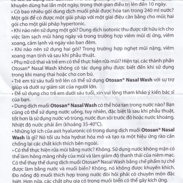 - Việc rửa mũi chỉ phải được thực hiện bằng nước pha với dung dịch muối Otosan Nasal wash.
