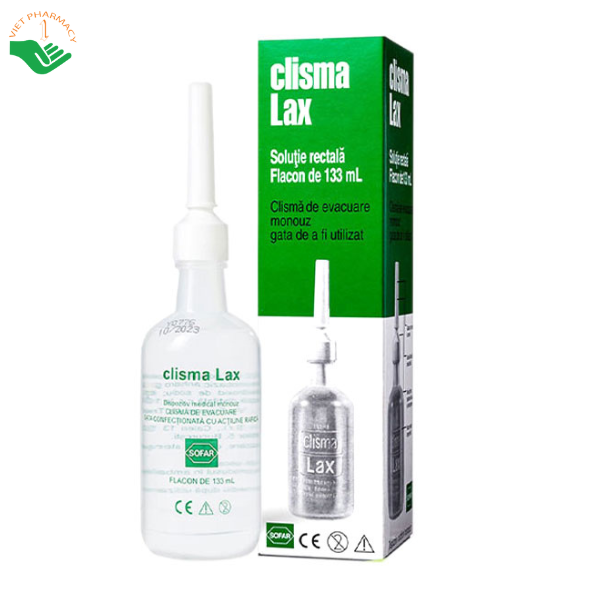 Các đặc tính dược lý. Clisma-Lax chứa 133 ml dung dịch ưu trương natri phosphat, ổn định và hệ đệm với pH 5,5. Việc thụt rửa chủ yếu do đặc tính ưu trương của dung dịch, đó là đặc tính chủ yếu của thuốc nhuận tràng dạng muối. Sau khi bơm thuốc vào trực tràng, tác dụng thẩm thấu của dung dịch sẽ kéo thêm nước từ các mô xung quanh làm tăng thể tích trong ruột kết. Việc tăng thể tích này gây tăng kích thích nhu động ruột và gây xố. Hiện tượng sổ xuất hiện khoảng năm phút từ khi bơm thụt thuốc.