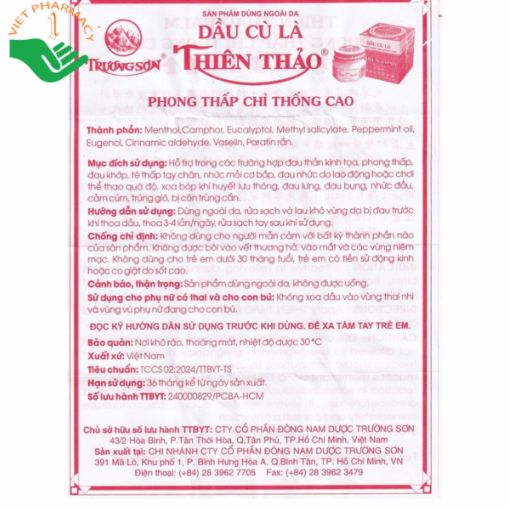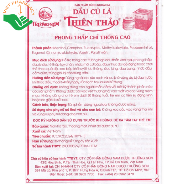 Câu hỏi thường gặp về Dầu Cù Là Phong Thấp Chỉ Thống Cao Thiên Thảo 30g Trường Sơn giảm đau thần kinh tọa, phong thấp, đau khớp