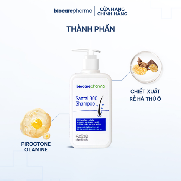 Mô tả sản phẩm Dầu gội gàu nấm Santal 300 Shampoo Biocare Pharma hỗ trợ làm sạch gàu, ngứa và nấm da đầu