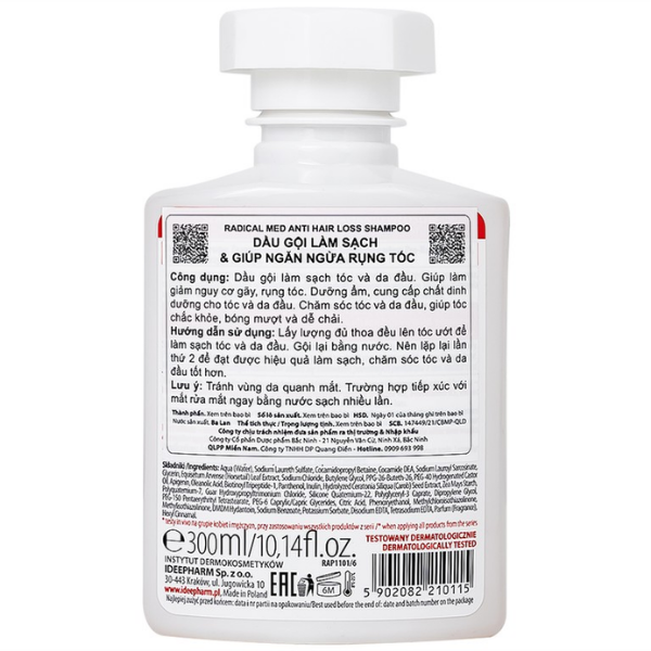 Dầu gội Radical Med Anti Hair Loss Shampoo được nhập khẩu từ Ba Lan, chứa các dưỡng chất lành tính, an toàn với da đầu của người dùng. Sản phẩm giúp hỗ trợ làm sạch da dầu, nuôi dưỡng mái tóc mềm mượt, chắc khỏe và ngăn ngừa nguy cơ tổn thương, gãy rụng tóc hiệu quả.