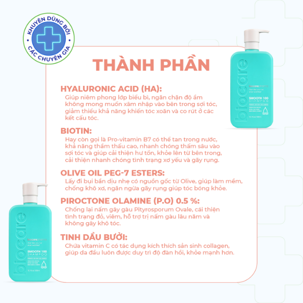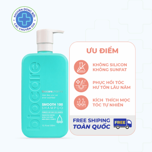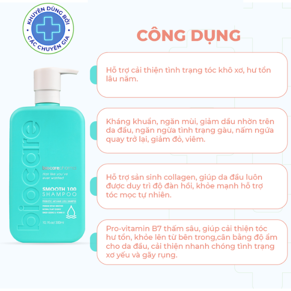Mô tả sản phẩm Dầu gội siêu phục hồi khô xơ và ngăn ngừa rụng tóc Smooth 100 shampoo Biocare Pharma giúp nuôi dưỡng mái tóc