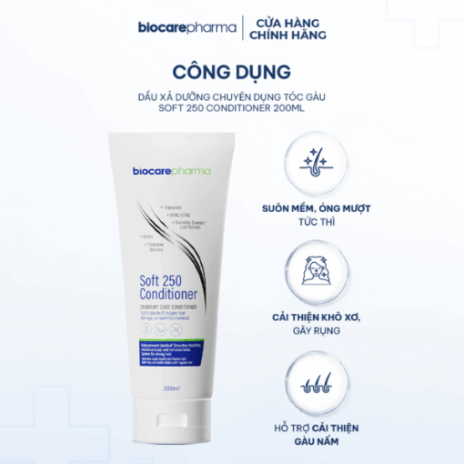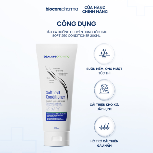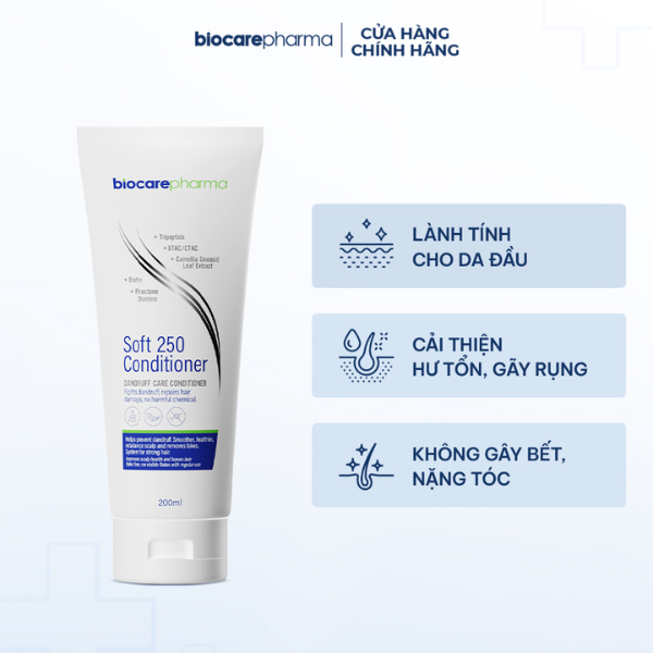 Dầu xả Soft 250 Conditioner là sản phẩm chuyên dụng giúp chăm sóc tóc gàu, nấm và hư tổn với công thức cải tiến từ Biocare Pharma dành riêng cho da đầu dễ bị gàu nấm.