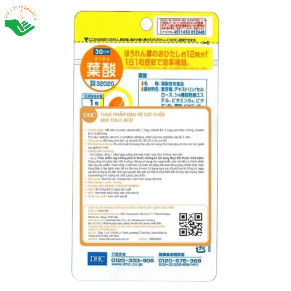 DHC Folic Acid là viên uống bổ sung acid folic (vitamin B9) và các vitamin nhóm B khác (30 viên) đến từ thương hiệu DHC Nhật Bản – thương hiệu nổi tiếng với các dòng thực phẩm bổ sung chất lượng cao, được nghiên cứu và sản xuất theo tiêu chuẩn nghiêm ngặt. Sản phẩm được thiết kế nhằm hỗ trợ bổ sung acid folic và vitamin nhóm B thiết yếu cho cơ thể, đặc biệt phù hợp với phụ nữ đang chuẩn bị mang thai, phụ nữ mang thai giai đoạn đầu, người có nhu cầu bổ sung vitamin B trong chế độ dinh dưỡng hằng ngày hoặc người có lối sống bận rộn, ăn uống chưa cân đối.