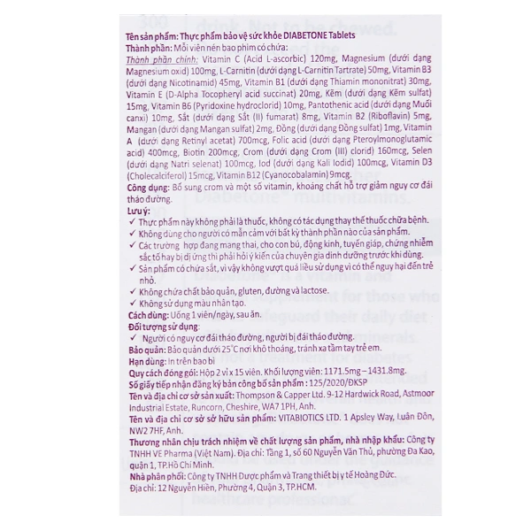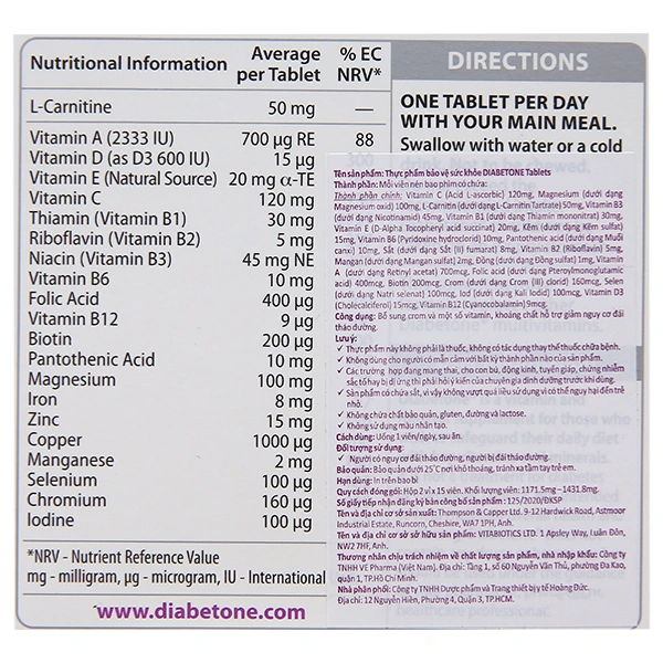VITABIOTICS DIABETONE ORIGINA là thực phẩm bổ sung đặc biệt được thiết kế để hỗ trợ sức khỏe tổng thể và cân bằng vi chất dinh dưỡng cho người mắc bệnh đái tháo đường. Sản phẩm cung cấp 21 loại vitamin và khoáng chất thiết yếu, giúp bù đắp sự thiếu hụt thường gặp do chế độ ăn kiêng và hỗ trợ duy trì các chức năng quan trọng của cơ thể. Diabetone Origina không phải là thuốc điều trị đái tháo đường mà là giải pháp hỗ trợ hiệu quả bên cạnh chế độ ăn uống và phác đồ điều trị của bác sĩ.