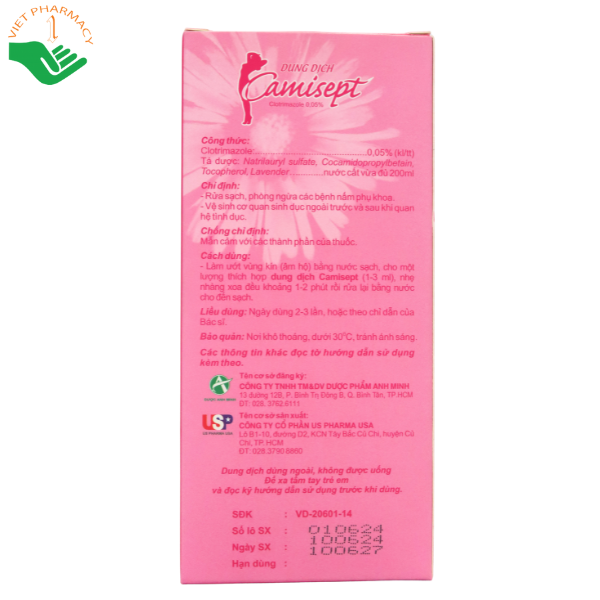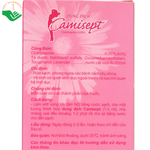 Camisept với thành phần chính là clotrimazol, có tác dụng tiêu diệt vi nấm gây bệnh, nhanh chóng lập lại cân bằng hệ vi sinh vật trong âm đạo. Đây là dung dịch chăm sóc, vệ sinh vùng kín hàng ngày, phòng ngừa bệnh viêm nhiễm phụ khoa giúp chị em phụ nữ thêm tự tin, hấp dẫn.