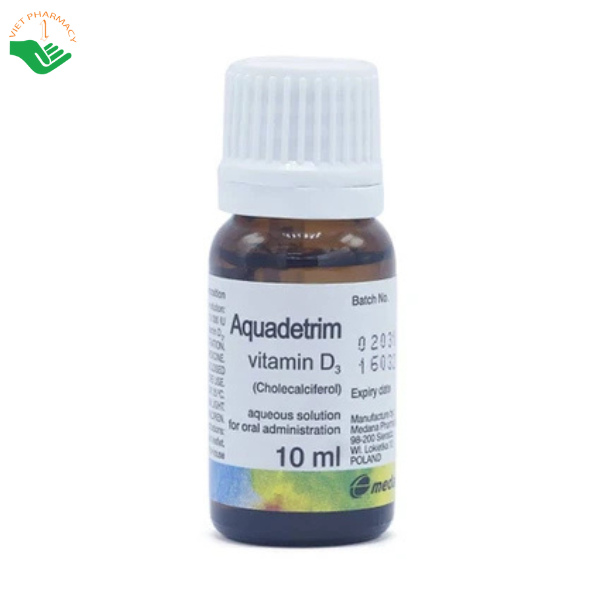Aquadetrim Vitamin D3 Medana là thuốc dạng dung dịch uống chứa vitamin D3 (cholecalciferol), giúp bổ sung vitamin D cho cơ thể, hỗ trợ hấp thu canxi và phospho.