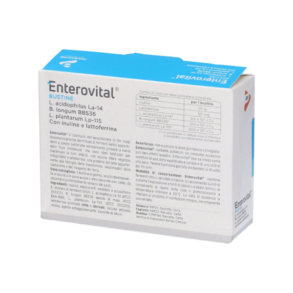 Mỗi gói Enterovital cung cấp hơn 10 tỷ lợi khuẩn sống, bao gồm các chủng đã được nghiên cứu lâm sàng như Lactobacillus acidophilus La-14, Lactobacillus plantarum Lp-115 và Bifidobacterium longum BB536. Các lợi khuẩn này giúp ức chế vi khuẩn có hại, hỗ trợ bảo vệ niêm mạc dạ dày và cải thiện chức năng tiêu hóa.