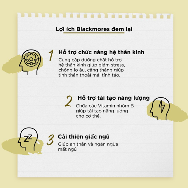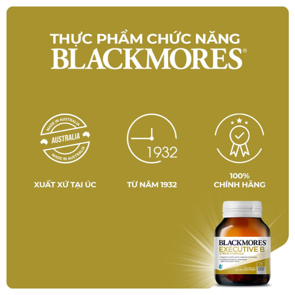 Blackmores Executive B Stress Formula cũng được đánh giá giúp ngăn ngừa kích ứng thần kinh kéo dài, hỗ trợ giấc ngủ và giảm cảm giác bồn chồn nhờ sự phối hợp các vitamin và khoáng chất thiết yếu.