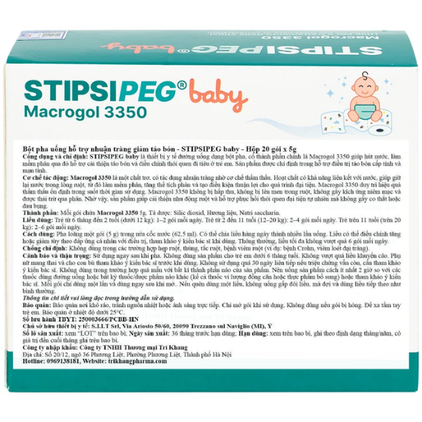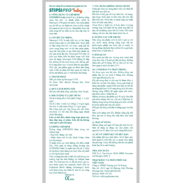 Bột pha uống hỗ trợ nhuận tràng giảm táo bón STIPSIPEG baby là thiết bị y tế đường uống dạng bột pha, có thành phần chính là Macrogol 3350 giúp hút nước, làm mềm phân qua đó hỗ trợ cải thiện táo bón và điều chỉnh thói quen đi tiêu ở trẻ em.