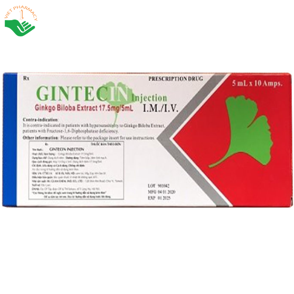 Thuốc Gintecin injection 17.5mg/5ml được chỉ định dùng để: Giảm thính lực (điều trị hỗ trợ) do hội chứng cổ; Rối loạn tuần hoàn động mạch ngoại biên với sự bảo tồn tuần hoàn nguyên vẹn (khập khuyểnh gián cách); Rối loạn chức năng não: Khó nhớ, chóng mặt, ù tai, nhức đầu và thay đổi xúc cảm kèm theo lo lắng.