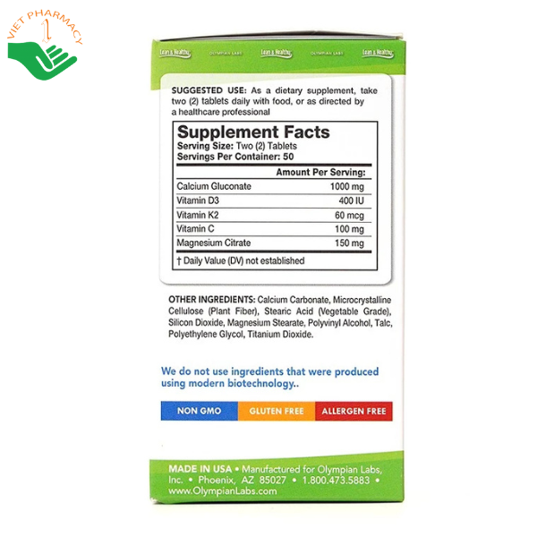 Mô tả sản phẩm Green Calcium Olympian Labs bổ sung canxi, Vitamin D3, Vitamin K2 hỗ trợ xương răng chắc khoẻ (Hộp 100 viên)