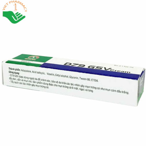 Kem bôi D79 GSV Cream là giải pháp chuyên biệt hỗ trợ điều trị mụn trứng cá, đặc biệt hiệu quả với các loại mụn cứng đầu, mụn sưng viêm hoặc mụn mủ lâu ngày. Sản phẩm kết hợp các thành phần có khả năng kháng viêm, giảm sưng đỏ và ngăn ngừa vi khuẩn gây mụn, giúp làm dịu vùng da bị tổn thương một cách nhanh chóng. D79 GSV Cream thẩm thấu sâu vào da, hỗ trợ loại bỏ bã nhờn và tế bào chết, từ đó ngăn chặn sự hình thành mụn mới và thúc đẩy quá trình phục hồi của làn da.