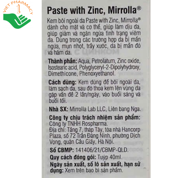 Mô tả sản phẩm Kem bôi Paste with Zinc của Mirrolla ®