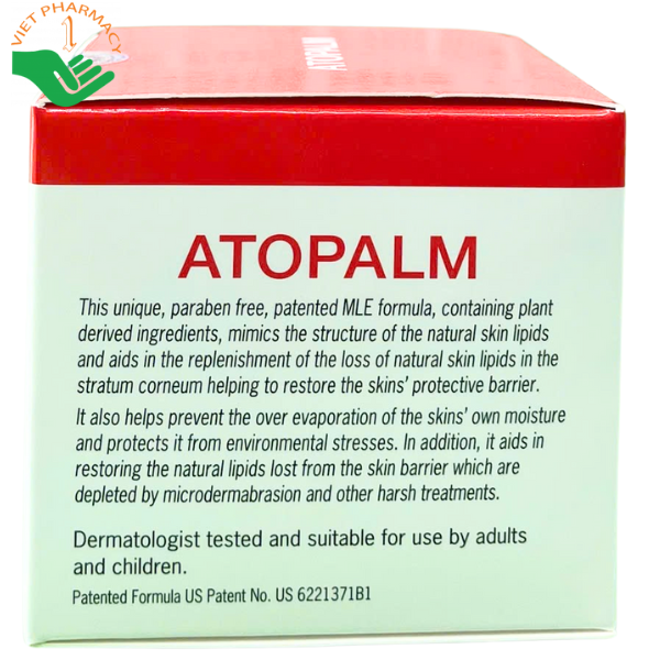 - Với các thành phần được chiết xuất từ thực vật, không chứa chất bảo quản paraben, công thức MLE mô phỏng giống với cấu trúc lipid tự nhiên của da, Atopalm bổ sung sự thiếu hụt của những lipid tự nhiên ở lớp sừng, giúp khôi phục và tăng cường chức năng hàng rào da, từ đó ngăn ngừa sự thoát hơi nước (tác dụng dưỡng ẩm sâu).