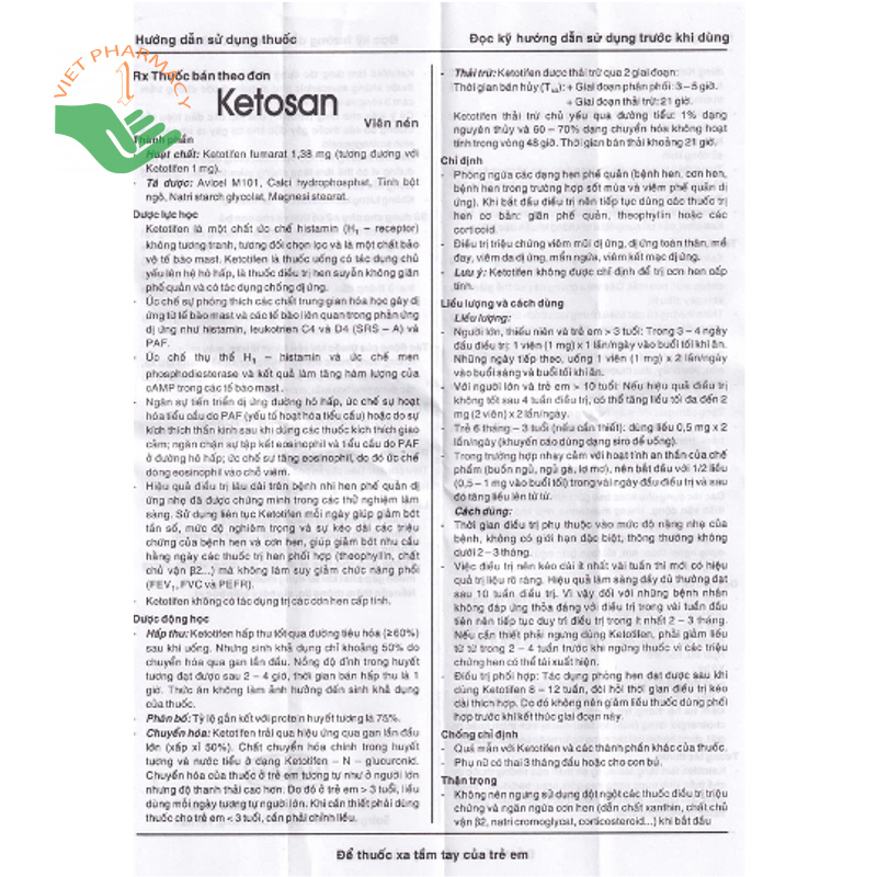 Chuyển hóa: Ketotifen trải qua hiệu ứng qua gan lần đầu lớn (xấp xỉ 50%). Chất chuyển hóa chính trong huyết tương và nước tiểu ở dạng Ketotifen – N – glucuronid. Chuyển hóa của thuốc ở trẻ em tương tự như ở người lớn nhưng độ thanh thải cao hơn. Do đó ở trẻ em > 3 tuổi, liều dùng mỗi ngày tương tự người lớn. Khi cần thiết phải dùng thuốc cho trẻ em < 3 tuổi, cần phải chỉnh liều.
