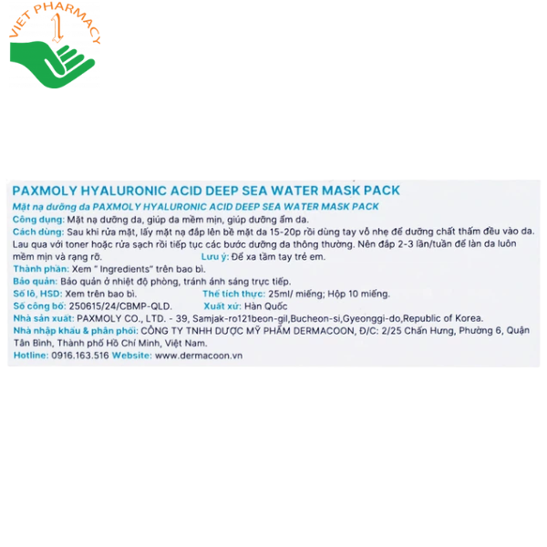 Câu hỏi thường gặp về mặt nạ PAX MOLY Hyaluronic Acid Deep Sea Water Mask Pack cấp ẩm nước biển sâu và làm dịu kích ứng