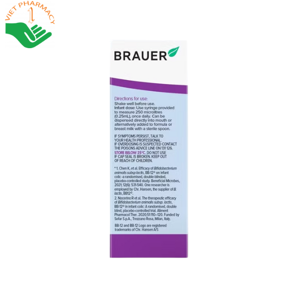 BRAUER ColicEze chứa chủng lợi khuẩn Bifidobacterium animalis ssp lactis BB-12 – một trong những chủng men vi sinh được nghiên cứu kỹ lưỡng và chứng minh hiệu quả lâm sàng trong việc cải thiện tiêu hóa, cân bằng hệ vi sinh đường ruột và giảm triệu chứng đau bụng, đầy hơi, quấy khóc ở trẻ sơ sinh. Việc bổ sung đúng cách mỗi ngày sẽ giúp tăng cường sức đề kháng và tạo điều kiện cho hệ tiêu hóa non nớt của trẻ hoạt động ổn định hơn. Đây là giải pháp nhẹ nhàng, tự nhiên, được nhiều phụ huynh tin dùng.