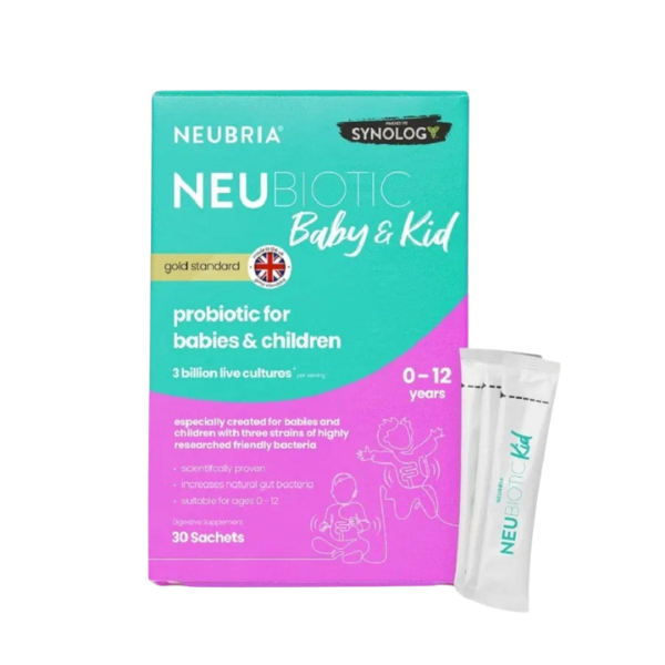 Hệ tiêu hóa của trẻ nhỏ vẫn đang trong quá trình hoàn thiện và rất nhạy cảm với các tác nhân bên ngoài. NeuBiotic Baby & Kid được Neubria (Anh Quốc) nghiên cứu đặc biệt để hỗ trợ xây dựng hệ vi sinh đường ruột vững chắc ngay từ những tháng đầu đời. Công thức chứa 3 tỷ lợi khuẩn từ 3 chủng được nghiên cứu lâm sàng: Bifidobacterium breve, Lactobacillus rhamnosus SP1 và CRL 1505, cùng chất xơ hòa tan FOS nuôi dưỡng lợi khuẩn phát triển. NeuBiotic Baby & Kid không chứa gluten, sữa, đậu nành và không có đường bổ sung, phù hợp kể cả trẻ ăn chay và các bé có hệ tiêu hóa nhạy cảm.