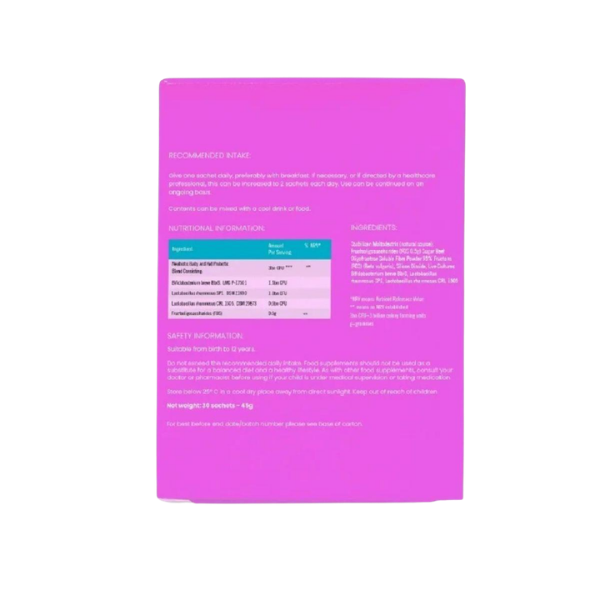 Bifidobacterium breve Bbr8 LMG P-17501: 1,5 × 10⁹ CFU; Lactobacillus rhamnosus SP1 DSM 21690: 1 × 10⁹ CFU; Lactobacillus rhamnosus CRL 1505 DSM 29673: 0,5 × 10⁹ CFU; Chất xơ hòa tan Fructooligosaccharide (FOS) từ củ cải đường 95% fructans: 0,5 g; Tá dược: Maltodextrin, Silicon Dioxide.