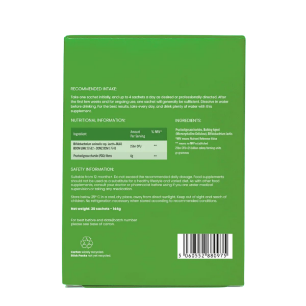 Chất xơ hòa tan FOS (4g/gói) từ nguồn tự nhiên đóng vai trò prebiotic, tạo môi trường thuận lợi nuôi dưỡng lợi khuẩn tăng trưởng bền vững. Sự kết hợp đồng bộ giữa probiotic và prebiotic tạo hiệu ứng synbiotic – cộng hưởng hiệu quả tốt hơn so với dùng từng thành phần riêng lẻ. Chất xơ FOS cũng góp phần làm mềm phân, hỗ trợ cải thiện tình trạng táo bón.