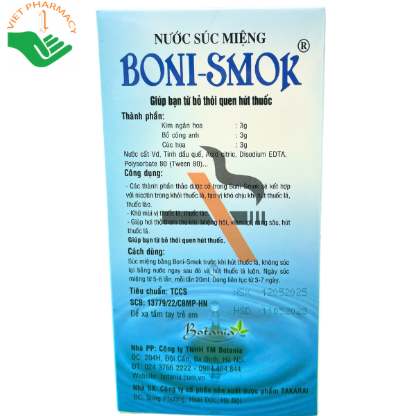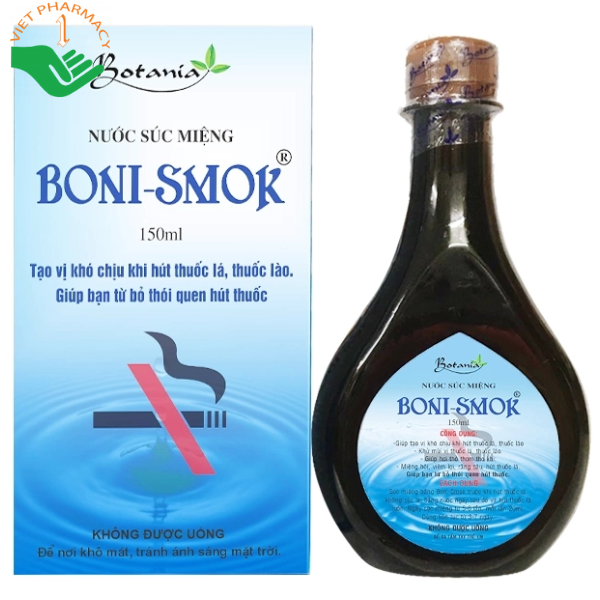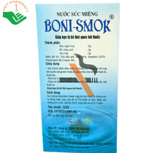 Nước súc miệng Boni Smok chứa các thành phần thảo dược kết hợp với tá dược thường dùng trong dung dịch súc miệng, giúp làm sạch và khử mùi khoang miệng. Khi dùng đúng hướng dẫn, Boni Smok không chỉ hỗ trợ cai thuốc mà còn giúp hơi thở thơm mát hơn, giảm mùi hôi khó chịu do thuốc lá gây ra.