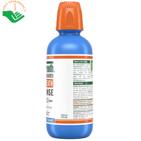 Nước súc miệng TheraBreath Icy Mint Fresh Breath là lựa chọn hoàn hảo cho những ai yêu thích cảm giác sảng khoái mạnh mẽ và hơi thở tươi mát bền lâu. Sản phẩm được phát triển bởi bác sĩ nha khoa Harold Katz – người tiên phong trong nghiên cứu về nguyên nhân gây hôi miệng – với công nghệ OXYD-8 độc quyền giúp trung hòa các hợp chất sulfur dễ bay hơi (VSCs), loại bỏ tận gốc mùi khó chịu thay vì chỉ che phủ tạm thời. Hương bạc hà lạnh (Icy Mint) mang đến làn gió mát sâu tức thì, cho cảm giác sạch khuẩn và tươi mới lan tỏa khắp khoang miệng mà không hề cay gắt hay khô rát.