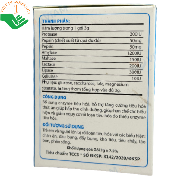 - Papain (chiết xuất từ quả đu đủ)……………………………………….50mg.