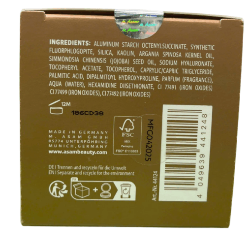 Aluminum starch octenylsuccinate, Synthetic fluorphlogopite, Silica, Kaolin, Argania spinosa kernel oil, Simmondsia chinensis (jojoba) seed oil, Sodium hyaluronate, Tocopheryl acetate, Tocopherol, Caprylic/capric triglyceride, Palmitic acid, Dipalmitoyl hydroxyproline, Parfum (fragrance), Aqua (water), Hexamidine diisethionate, CI 77491 (Iron oxides), CI 77499 (Iron oxides), CI 77492 (Iron oxides).