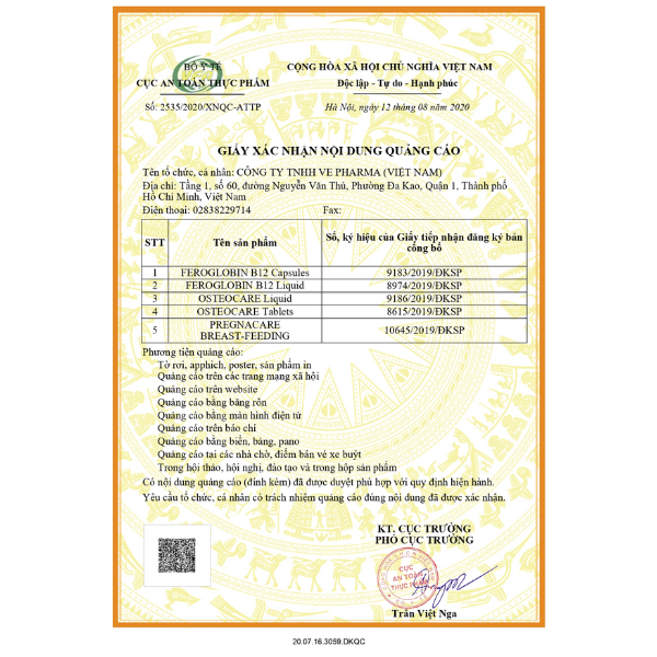 - Giấy xác nhận nội dung quảng cáo: 2535/2020/XNQC-ATTP