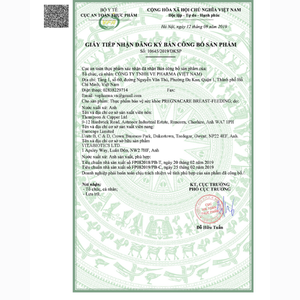 - Giấy tiếp nhận đăng ký bản công bố sản phẩm: 10645/2019/ĐKSP