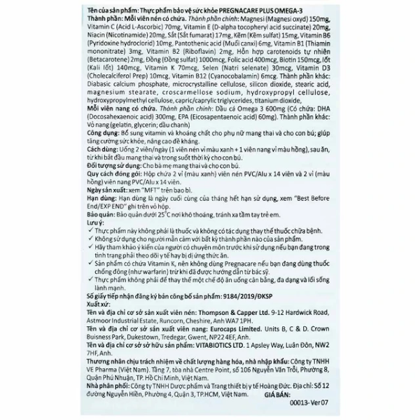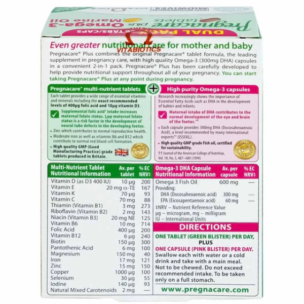 Thực phẩm bảo vệ sức khỏe PREGNACARE PLUS OMEGA-3 là thực phẩm bổ sung vi chất dinh dưỡng cho phụ nữ mang thai và cho con bú đến từ Anh Quốc. Sản phẩm có sự kết hợp độc đáo giữa viên nén chứa 19 vitamin & khoáng chất với viên nang Omega-3 cung cấp đủ 300 mg DHA và 60 mg EPA mỗi ngày, giúp cung cấp đầy đủ các vi chất quan trọng cho cả mẹ và bé. Pregnacare Plus Omega-3 là lựa chọn phù hợp cho Mẹ bầu trong suốt thai kỳ và giai đoạn cho con bú.