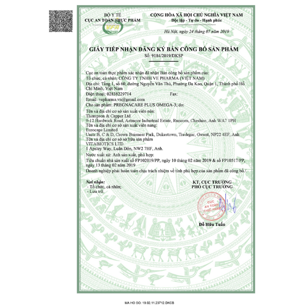 - Giấy tiếp nhận đăng ký bản công bố sản phẩm: 9184/2019/ĐKSP