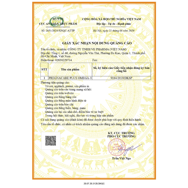 - Giấy xác nhận nội dung quảng cáo: 2651/2020/XNQC-ATTP