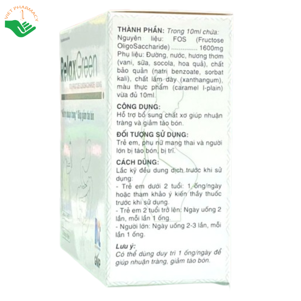 Relaxgreen là thực phẩm bảo vệ sức khỏe dạng dung dịch uống, bổ sung FOS – một loại chất xơ hòa tan giúp hỗ trợ nhuận tràng tự nhiên, làm mềm phân và cải thiện tình trạng táo bón. Sản phẩm phù hợp sử dụng cho nhiều đối tượng, kể cả trẻ nhỏ và phụ nữ mang thai khi dùng đúng liều lượng khuyến cáo.