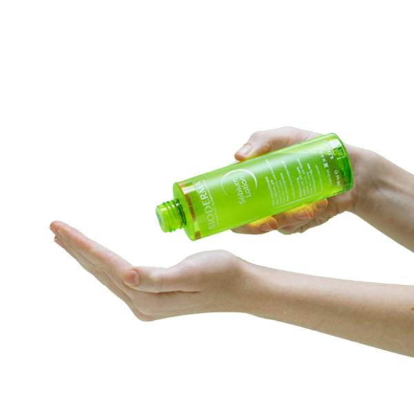 - Bước 2: Đổ một lượng vừa đủ Sébium Lotion vào lòng bàn tay hoặc thấm vào bông tẩy trang.