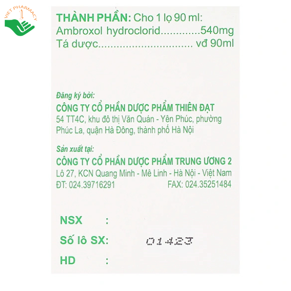 Thành phần hoạt chất: Ambroxol hydroclorid 540 mg.