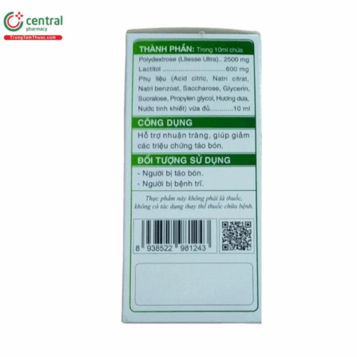 - Thành phần trong mỗi ống Siro 10ml gồm có: Polydextrose (Litesse Ultra); Lactitol; Các phụ liệu khác vừa đủ 1 mg
