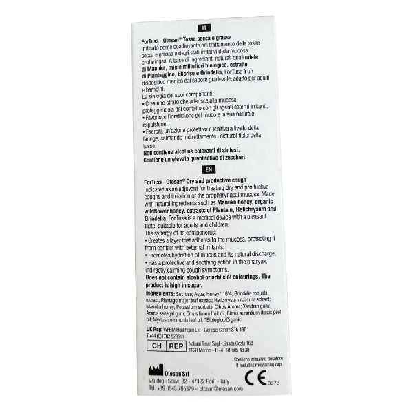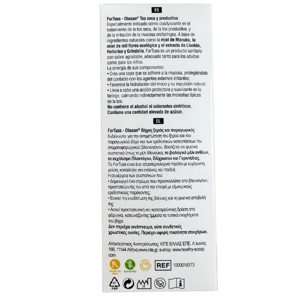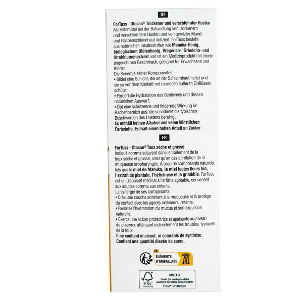 - Siro ho FORTUSS OTOSAN COUGH SYRUP tác động lên niêm mạc bị kích thích. Nhờ sự hợp lực của các thành phần trong siro ho ForTuss, tạo ra một lớp bảo vệ bám dính vào niêm mạc, đảm bảo hydrat hóa và chống lại kích ứng. Grindelia và Helichrysum, kết hợp với các đặc tính của mật ong Manuka và mật ong hoa dại hữu cơ, mang lại tác động bảo vệ và làm dịu cổ họng, làm dịu các triệu chứng ho cả vào ban ngày và ban đêm.