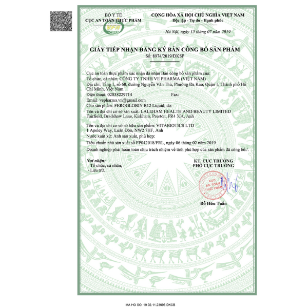 - Giấy tiếp nhận đăng ký bản công bố sản phẩm: 8974/2019/ĐKSP