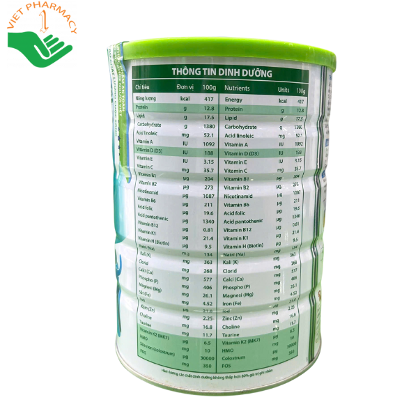 Sữa bột béo tan nhanh, Sữa bột nguyên kem (Whole milk powder), Bột sữa gầy, maltodextrin, đường dextroza (dextrose monohydrate), chất xơ hòa tan (oligofructose), bột sữa non bò (0.03 g), 2′-fucosyllactose, Choline, Taurine, Khoáng chất [Calcium carbonate, Tricalcium diphosphate, ferrous sulphate, zinc sulphate, magnesium oxide, potassium iodide], Vitamin A (Retinyl acetate (Vitamin A)), Cholecalciferol (Vitamin D3), D-alpha-Tocopherol (Vitamin E), Ascorbic acid (Vitamin C), Thiaminchloride hydrochloride (Vitamin B1), Riboflavin (Vitamin B2), Nicotinic acid (Niacin), D-Panthenol (Pantothenic acid), Pyridoxine hydrochloride (Vitamin B6), Biotin (Vitamin H), N-Pteroyl-L-glutamic acid (Folic acid), Phytonadione (Vitamin K1), Cyanocobalamin (Vitamin B12).