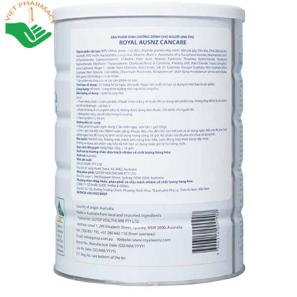 Sữa Royal Ausnz Cancare là sản phẩm dinh dưỡng chuyên biệt được nghiên cứu dành cho người đang điều trị ung thư hoặc có thể trạng suy nhược, sụt cân, ăn uống kém. Công thức sữa được xây dựng với hàm lượng năng lượng cao, protein chất lượng cùng các vitamin và khoáng chất thiết yếu, giúp hỗ trợ bù đắp thiếu hụt dinh dưỡng, góp phần nâng cao thể trạng và cải thiện sức khỏe tổng thể cho người bệnh trong giai đoạn cần chăm sóc đặc biệt.