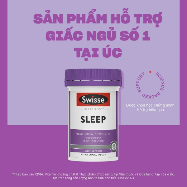 Swisse Ultiboost Sleep là sản phẩm hỗ trợ giấc ngủ từ thương hiệu Swisse (Úc), được xây dựng trên nền tảng y học thực chứng kết hợp với kho tàng thảo dược truyền thống. Công thức độc đáo tích hợp 6 thành phần tự nhiên hoạt động cộng hưởng, hỗ trợ toàn diện từ thư giãn tinh thần đến cải thiện chất lượng giấc ngủ. Sản phẩm hoàn toàn không chứa thành phần gây nghiện hay an thần tổng hợp, phù hợp với người ăn chay và ăn kiêng.