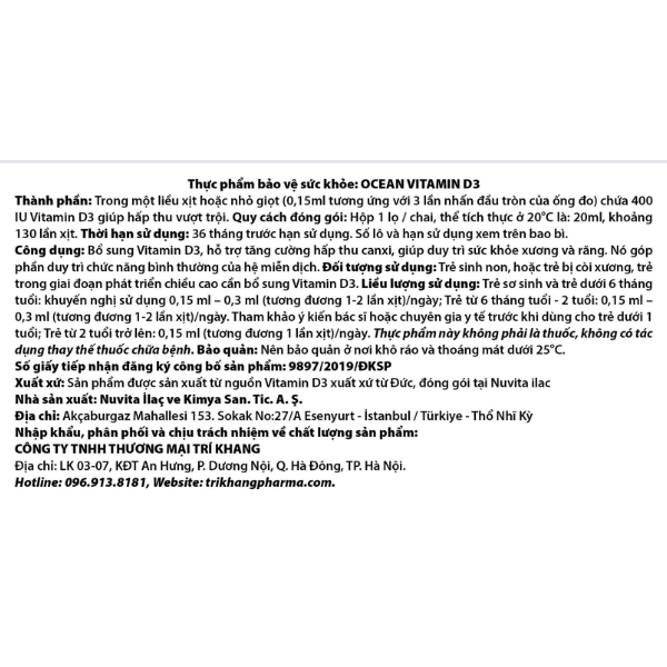 Ocean Vitamin D3 là thực phẩm bảo vệ sức khỏe, có thể sử dụng để hỗ trợ duy trì nồng độ vitamin D ổn định cho trẻ khi dùng đúng theo khuyến nghị. Để đạt hiệu quả tốt, nên kết hợp với chế độ dinh dưỡng hợp lý và theo dõi sự phát triển của trẻ theo từng giai đoạn.