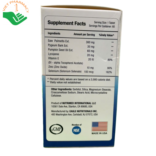 Chiết xuất cọ lùn (Saw Palmetto) (360 mg), Chiết xuất vỏ cây anh đào Châu Phi (Pygeum Bark) (Pygeum africanum) (30 mg), Chiết xuất dầu hạt bí ngô (Pumpkin Seed Oil) (60 mg), Lycopene (20 mg), Vitamin E (DI-alpha Tocopherol Acetate) (13,4 mg/20 IU), Kẽm Oxit 12,5 mg (Zinc 10 mg), Selenium Selenate 238 mcg (Selenium 100 mcg).