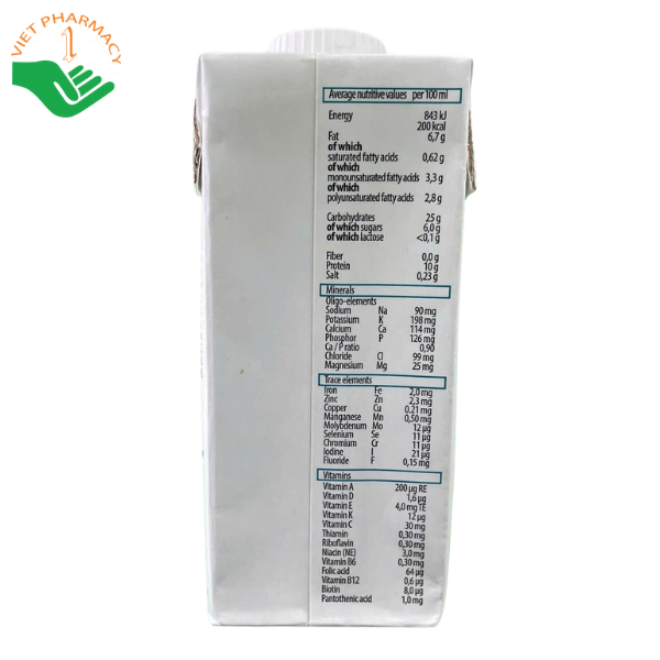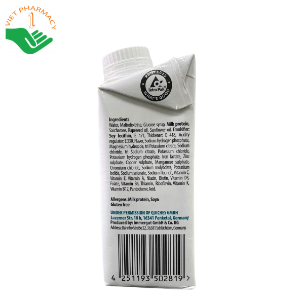 Nước, maltodextrin, xi-rô glucose, bạch sữa, đường saccharose, dầu hạt cải, dầu hạt hướng dương, chất nhũ hóa (lecithin đậu nành ins 322, ins 471), chất làm dày (ins 418), chất điều chỉnh độ axit (ins 330), hương liệu tổng hợp (hương vani), natri hydro phosphat, magie hydroxit, trikali citrat, natri clorua, trinatri citrat, kali clorua, kali hydro phosphat, sắt lactat, sơn sunfat, đồng sunfat, mangan sunfat, crom clorua, natri molybdat, kali iodua, natri selenat, rutin bột mì, vitamin c, vitamin e, vitamin a, niacin, biotin, vitamin d3, folat, vitamin b6, thiamin hydroclorid, vitamin k, vitamin b12, axit pantothenic, riboflavin.