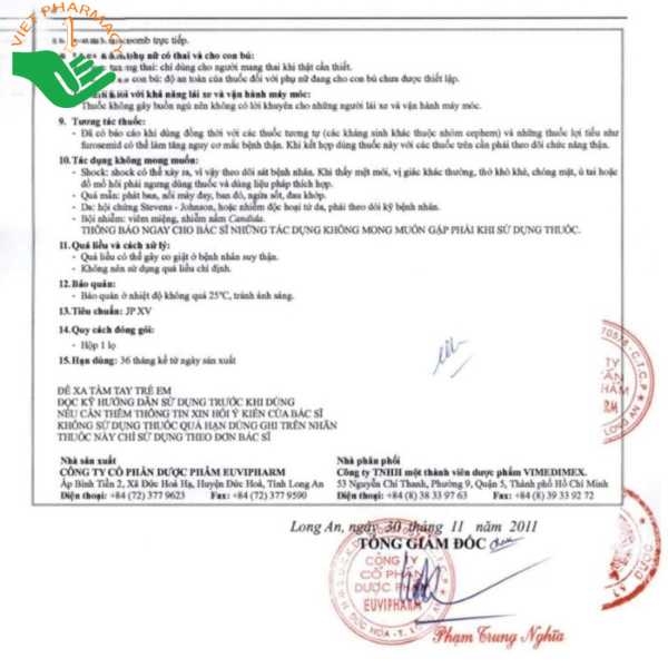 - Tiêm tĩnh mạch ngay sau pha với nước cất pha tiêm, Dung dịch NaCl 0,9% hoặc Glucose 5%.